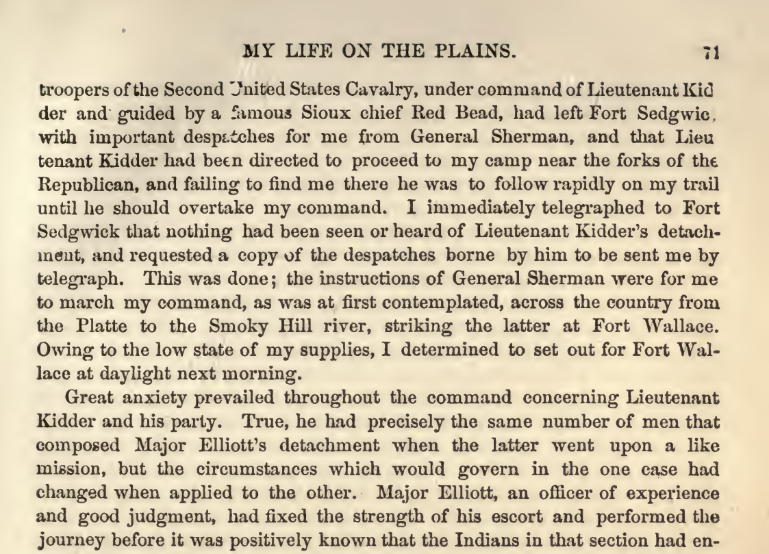 Полагая, что кроме уже полученных, Генерал Шерман уже направил в Форт Седжвик и новые инструкции для меня, я послал телеграмму командовавшему Фортом офицеру, с запросом на этот счёт. К моему удивлению, в ответ я получил сообщение, из которого следовало, что через день после того, как Майор Эллиот со своим отрядом выехал из Форта Седжвик, с донесениями, которые были упомянуты ранее, еще один отряд такой же численности, то есть десять бойцов из Второго Кавалерийского полка армии соединенных Штатов, под командой Лейтенанта Ки́ддера (англ. Lieutenant Kidder), и с известным вождём Сиу по имени Красная Бусина (англ. Red Bead (Рэд Би́ид), см. примечание в комментах) в качестве проводника, вышел из Форта Седжвик с важными сообщениями для меня от Генерала Шермана, и что Лейтенанту Киддеру было предписано было направиться к моему лагерю у развилок Рипа́бликэн, а если он там меня не застанет, - двигаться как можно быстрей по моим следам, пока он не догонит мою команду. Я немедленно телеграфировал в Форт Седжвик, что нам ничего не известно об отряде Лейтенанта Киддера, и запросил, чтобы мне по телеграфу выслали копии сообщений, которые он вёз. Копии сообщений были получены, в них содержались инструкции от Генерала Шермана, предписывавшие мне, как ранее и предполагалось, вести свою команду напрямую от реки Платт к Реке Дымящегося Холма (англ. Smoky Hill river), выйдя к последней у Форта Во́ллас.