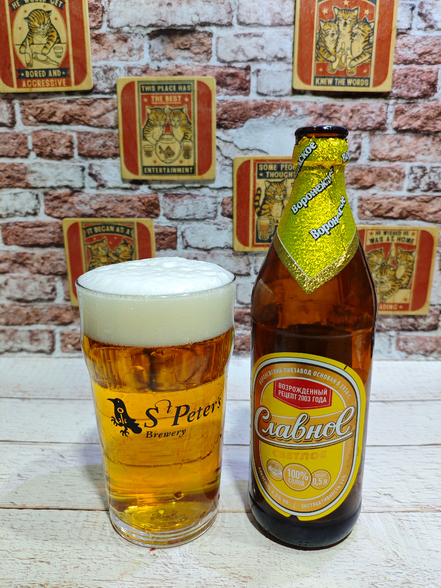 Когда покупал это пиво, то повёлся на дизайн и кричащую надпись "Воронежское". Был уверен, что это нЕчто региональное и местечковое. Когда налил пиво в бокал и стал оценивать ароматику, то сразу появились подозрения. Полез читать, кто же изготовил его... А изготовили это пиво на "Воронежском пивзаводе" в городе Воронеже. То есть "Пивоваренная компания Балтика". К слову, на сайте пивоварни этого пива я не нашёл. ********************************************************************************** Плотность: 11%. Состав: вода питьевая очищенная, солод пивоваренный ячменный светлый и карамельный, хмелепродукты. Срок годности: 12 месяцев при температуре хранения от 0℃ до +30℃. С даты розлива моей бутылки прошло 4 месяца. ********************************************************************************** Пена на месте; держится уверенно и полностью не растворяется. В аромате в каком-то смысле типичная "Балтика": сладковатый солод с оттенком картона. Карбонизация конечно же высокая. Вкус соло