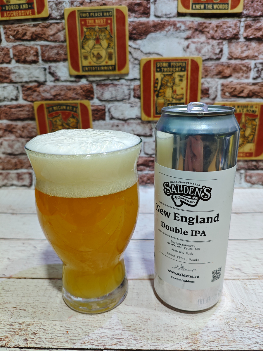 Вчерашняя статья была посвящена Salden's New England IPA на хмеле Mosaic. Ну а сегодня речь пойдёт о двойном IPA в стиле New England на хмеле Citra и Mosaic от всё той же тульской пивоварни Salden's (ООО "Добрый Хмель"). На сайте пивоварни как всегда нужного для статьи сорта не найти. На UNTAPPD тоже тихо. ********************************************************************************** Плотность: 18%. Горечь: 80 (на UNTAPPD). Состав: вода, солод пивоваренный, хмель, дрожжи. Срок годности: 180 суток при температуре от +2℃ до +24℃. С даты розлива моей банки прошло чуть менее 1.5 месяцев. ********************************************************************************** Так как оба пива были выпиты одно за другим, то сравнения не избежать. Пена пышнее; её больше и стойкость выше. Ароматика хмелевая больше в тропики; немного цитрусов; интенсивная и чуть сладковатая. Карбонизация умеренная. Вкус в целом тот же, что и у NE IPA, но здесь баланс чуть сместился в сторону тропиков. Хотя цитру