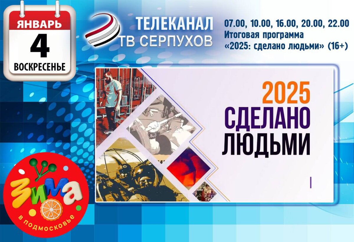 ! 07.00, 10.00, 16.00, 20.00, 22.00 итоговая программа «2025: сделано людьми» (16+) 06.30, 09.00, 17.10 м/ф «Мультфильмы» (6+) 07.30, 17.35, 05.45 д/ф «Вместе по России» (12+) 08.05, 04.45 д/ф «Я уколов не боюсь» (12+) 09.05, 10.35, 19.05, 20.35 т/с «Серебряный бор» (12+) 11.30, 23.50 т/с «Цыпленок жареный» (16+) 13.15, 01.40 т/с «Новогодний переполох» (16+) 15.05, 16.35, 03.20 х/ф «Однажды в Новый год» (12+) 18.10 д/ф «Пушкины» (12+) 18.35 д/ф «На пути к победе» (6+) 21.30, 22.35 т/с «Кто-то теряет, кто-то находит» (12+)