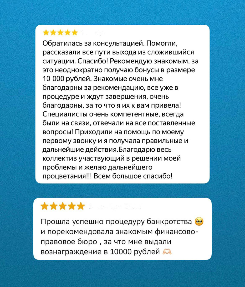 Дарим 10.000р каждому, кто порекомендует нас 🔥 Новые отзывы от участников нашей реферальной программы! Многие на своем опыте узнали как проходит процедура и работа с нами, и теперь активно рассказывают об этом всем знакомым. Ведь это не только способ заработать, но и возможность помочь ближнему выйти из трудной финансовой ситуации! Но даже если вы не являетесь нашим клиентом - нет никаких ограничений для участия в акции! 🔹Расскажите про нас другу/родственнику/коллеге/соседу (не забудьте подарить или отправить ему сертификат*) 🔹 Человек по вашей рекомендации заключает с нами договор со скидкой 20.000₽ 🔹 Вы получаете вознаграждение 10.000₽ *Чтобы получить персональный сертификат для рассылки друзьям - напишите нам А если в вашем городе есть наш офис, заходите в гости и забирайте нужное количество сертификатов Вы всегда можете написать или позвонить нам, где бы вы не находились. Консультация бесплатно! Наш сайт https://fpburo.ru Если вы в трудной ситуации и Вам нужна консультация