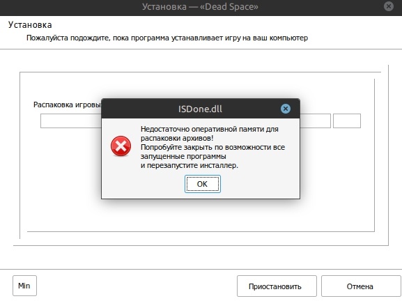 Решил я понастольгировать и снова поиграть в Dead Space 1. Но сам давно на Linux сижу (у меня Linux Mint 22.2 Cinnamon), поэтому установка пошла не по «виндовому» сценарию — вылезло окно ISDone.dll с текстом про нехватку памяти при распаковке. У меня 64 ГБ оперативки, и всё равно “не хватает памяти”.