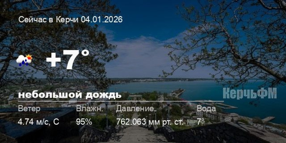 Сегодня днем в Керчи, 04 января, ожидается небольшой дождь, температура воздуха от +6.3° до +10.9°С, ветер северный 13.16 м/с, порывы до 11.29 м/с, давление 761.3 мм рт. ст., влажность 93%. Ближайшей ночью ожидается пасмурная погода, температура +11.1°С. Завтра, 05 января, в течение суток ожидается пасмурная погода; ночью +11.1°С, днем +8°С, ветер северный 4.84 м/с. - Феодосия от +6.8° до +11.2°С, ⛅ небольшой дождь, море: 4°C - Судак от +6.1° до +8... подробнее Подписывайся на КерчьФМ.РФ @kerchfm