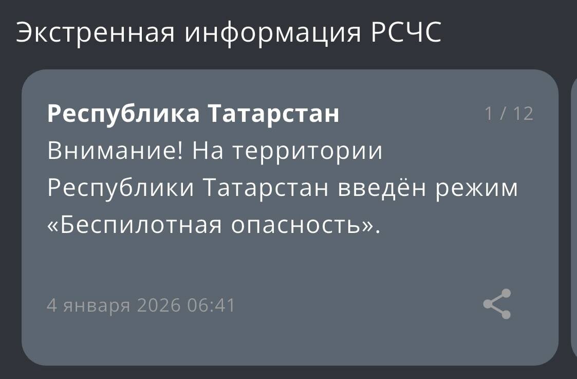 На территории Татарстана с 6:41 действует режим «Беспилотная опасность».