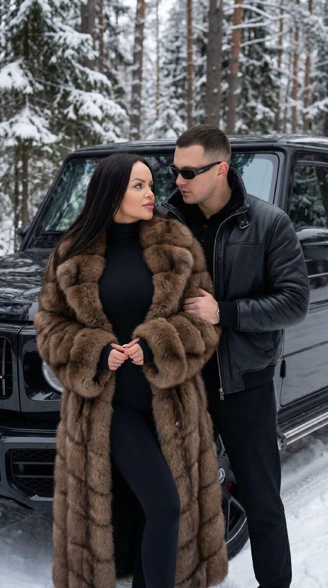😈 Для автоматического создания фото жмите сюда Для ручной генерации: ⚙️ Нейросеть: Banana ⚙️ Промт (текст запроса): Создай: Реалистичный снимок, высокая детализация лица, не меняя внешности женщины. Кадр на заснеженной лесной дороге при холодном мягком зимнем освещении, подчеркивающем контраст суровой природы и гламура. Портретная съемка. Женщина стоит у черного 2025 Mercedes-Benz G-Klasse, смотрит в камеру, Мужчина стоит рядом с ней, правой рукой приобнимая её за талию. На ней черное облегающий комбинезон с длинными рукавами и высоким горлом, длинная,объемная ,натуральная меховая длинная шуба коричневого цвета с фактурой, руки перед собой. длинные ровные волосы на плечах. На нем черная кожаная зимняя куртка, под ней виднеется черная кубашка. Черные брюки и также черные узкие солнцезащитные очки. Свет и тени акцентируют линии тела и стройность поз. мощная машина на фоне сочетает индустриальную холодность с природной суровостью. Снег покрывает землю, создавая контраст тепла меха и м