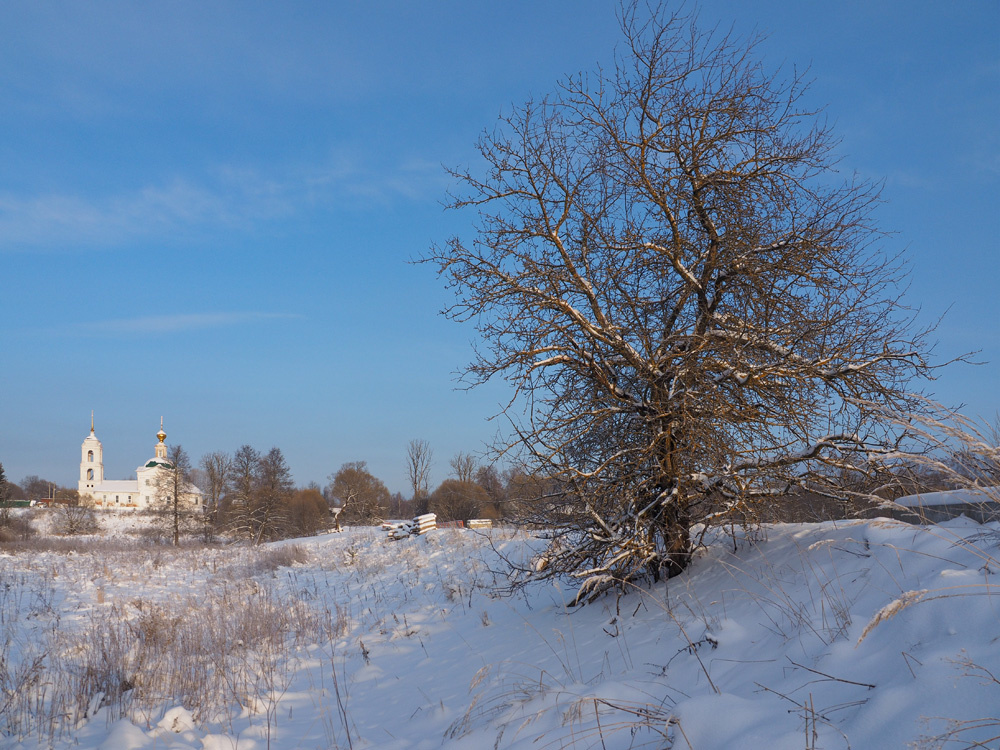 На второй день Нового года сохранилась морозная погода. Синоптики даже обещали несколько часов солнечной погоды. В полдень вышло солнце, и нужно было торопиться. Учитывая дефицит времени, для прогулки выбрал самое близкое от города место с красивой природой. Это окрестности села Сидоровское Ивановского района. Живописность местности придает речка Молохта с Предтеченской церковью на крутом берегу. Пока выпало мало снега, была возможность полазить по целине. Обычно съемку начинаю с дикой яблони, создающей вместе с храмом красивую композицию. У яблони удобно спуститься вниз, чтобы направиться в сторону Молохты. По пути всегда есть возможность сделать несколько симпатичных кадров. В низине у реки от Молохта ответвляется узкий рукав. Он еще не весь замерз, и можно было найти участки с открытой водой. Здесь же можно было увидеть следы бобриной работы. Свежий снег был весь в следах. Цепочка лисьих следов указывала на то, что зверек приходил напиться из реки. Если развернуться и встать против