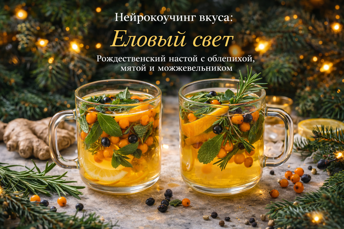 Рождественский настой с облепихой, мятой и можжевельником Когда в комнате горит свеча, хочется, чтобы вкус звучал так же тёпло и чисто. Облепиха даёт янтарь и бодрящую кислинку, мята - прозрачное дыхание, можжевельник приносит лес, а крошечная иголочка розмарина делает аромат объёмным, как воздух у зимней ели. Облепиха (свежая или замороженная) — 150–180 г; раздавить ложкой, чтобы выпустить сок.