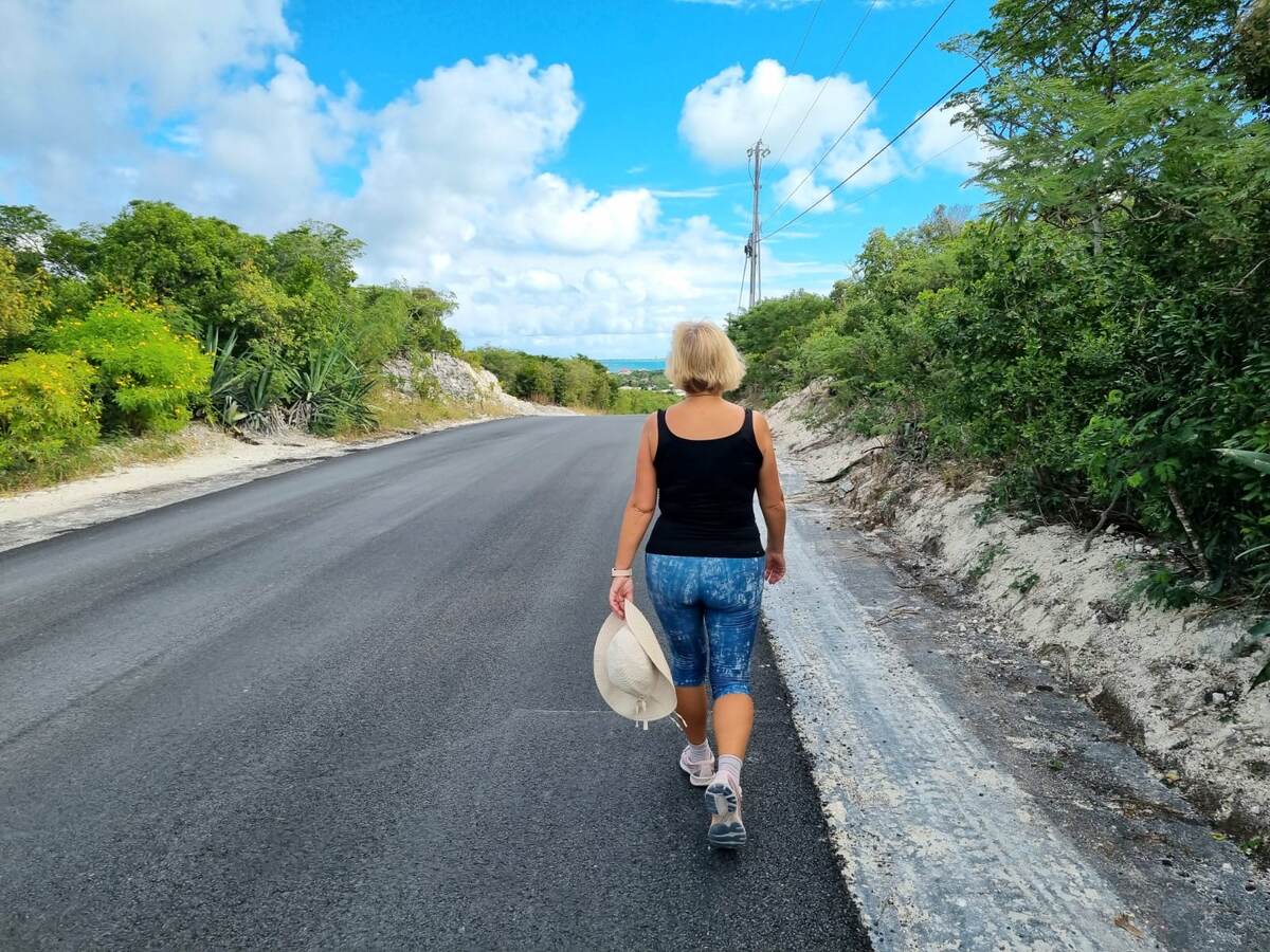 Мы шагаем по пляжу Грейс Бэй бич, который несколько лет подряд объявляется в Трипадвайзере одним из лучших пляжей мира - белый песок, белые полотенца, бирюзовая вода, комфорт.