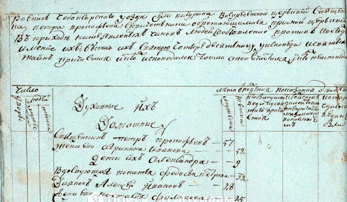 ГИА Чувашской Республики (ГИА ЧР), фонд № 225, опись № 7, дело № 28, стр. 358 скан. Роспись Чебоксарского уезда села Бичурина Воскресенской церкви священника Петра Прокофьева с причетники обретающимися при оной церкви в приходе нижеявленых чинов людей со изьявлением против коегождо имени о бытии их в Святую Четыредесятницу у исповеди и Святых таин причастия, и кто ж исповедовался токмо а не причастился, и кто не исповедался. Духовные и их домашние. Дьячек Андрей Михайлов. 25 лет. Жена ево Наталья Борисова. 25. Пономарь Яков Борисов. 40. Жена ево Агрипина Прокофьева. 31. Дети их: Евграф. 14. Петр. 9. Ефим. 7. Николай. 2. У него мать Катерина Семенова. 62. https://yandex.ru/archive/catalog/52edba86-9185-4731-b813-d9e6b809db55/358
