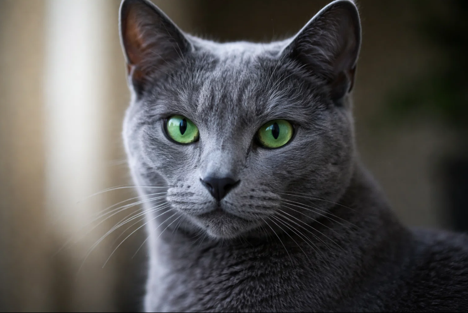 Внешность русской голубой — это гармония изящества и силы. Это кошки среднего размера с удлиненным, гибким телом, кажущимся более легким из-за особого строения. Мускулатура развита, но не массивна, что создает впечатление элегантной силы. Конечности длинные и стройные, лапы овальные, аккуратные. Движения русской голубой полны грации и плавности, словно она парит над землей. Голова имеет форму короткого клина с высоким плоским черепом и сильным подбородком. Профиль прямой, без стопа. Особое внимание привлекают большие, широко расставленные уши, заостренные на кончиках, будто бы настороженно прислушивающиеся к каждому звуку. Но истинная жемчужина во внешности этой кошки — ее глаза. Большие, миндалевидные, широко расставленные, они имеют исключительно яркий, насыщенный зеленый цвет без примеси желтизны. Этот изумрудный взгляд, контрастирующий с голубой шерстью, создает незабываемое впечатление глубины и проницательности.