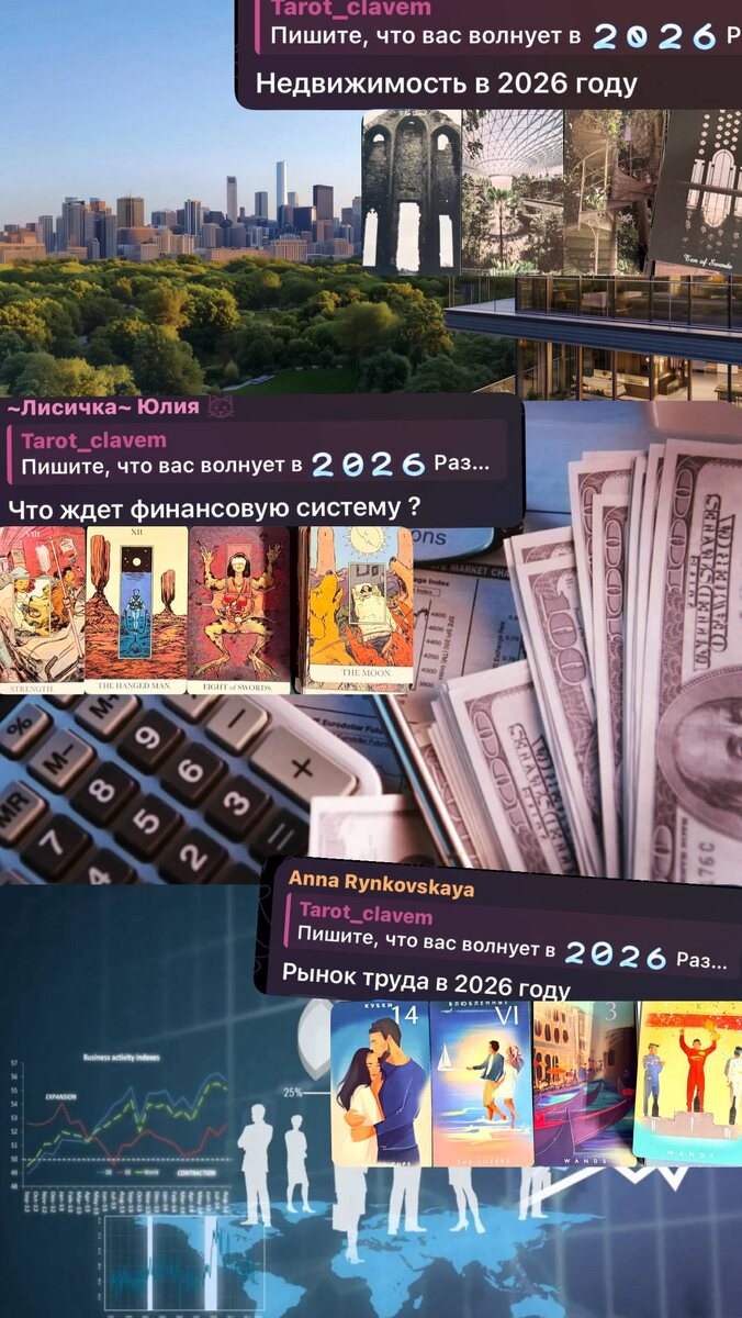 ? Отвечаю на ваши вопросы из 2025🪄 🏠Недвижка—тема болезненная и таковой и останется: к сожалению, принятые в прошлом изменения (10 мечей, 8 кубков), отмена большинства субсидий, льгот и упразднение др.ипотечных плюшек, приведет рынок недвижимости к аркану Дьявол. Это и еще более высокие ставки, проценты по взносам (для тех, кто впишется в условия ипотек), короче система по Королеве мечей станет жестче и купить что-то реально будет, только «особенно бережливым», с накоплениями в кармане (Королева пентаклей). Дьявол правит балом в этой сфере. 💰Финансы волнуют всех, кризис подбирается все ближе: аркан Луна и 10 мечей в основе, говорят о том, что ранее принятые решения на верхушке, постепенно заводят всех нас в тупик и неопредеденность финансового будущего становится все сильнее в 2026. Хорошая новость в том, что в этом году вряд ли что-то кардинально поменяется (падение системы и прочие страшилки), об этом говорит аркан зависших состояний Повешенный, да и задача сейчас «не победить,