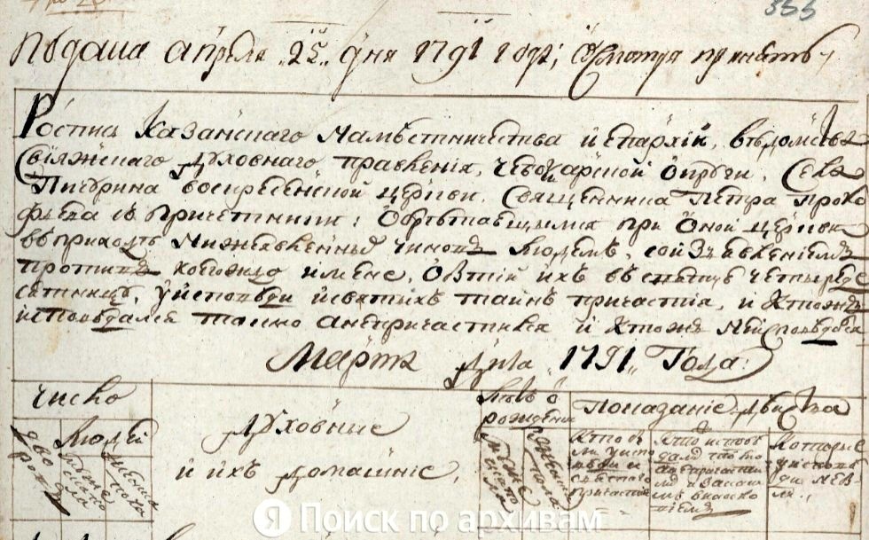 ГИА Чувашской Республики (ГИА ЧР), фонд № 225, опись № 7, дело № 12, стр. 693 скан. Подана апреля 25 дня 1791 года. Роспись Казанского наместничества и епархии Ведомства Свияжского духовного правления Чебоксарской округи села Пичурина Воскресенской церкви священника Петра Прокофьева с причетники обретающимся при оной церкви в приходе нижеявленых чинов людем со изьявлением против коегождо имени о бытии их в Святую Четыредесятницу у исповеди и Святых таин причастия, и кто ж исповедовался токмо а не причастился, и кто ж не исповедывался. Марта дня 1791 года. Духовные и их домашние. 4. оной же церкви вторый пономарь Яков Борисов. 19 лет. У него жена Овдотья Иванова. 20. https://yandex.ru/archive/catalog/5842a248-9bbb-4c0e-857f-607d49675a8b/693