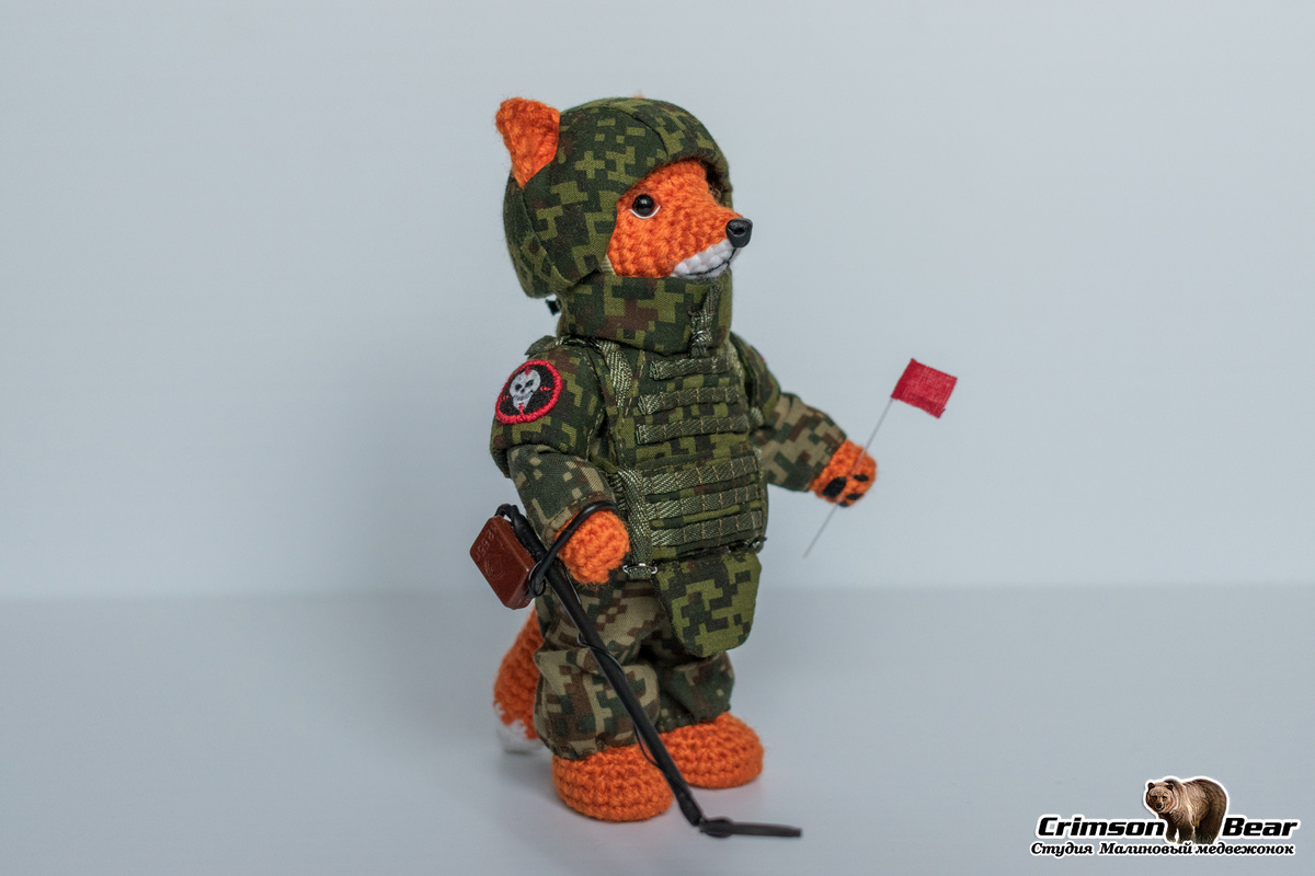 Размер сувенира 15 см. Подвижные лапы на каркасе и голова на шплинтовом креплении. Специальная петелька для подвешивания. Каску и бронежилет можно снимать. Усиленный бронежилет с воротом, нарукавниками и напашником. В лапах миноискатель и сапёрные флажки. Контакты для заказа: Телеграм или во ВКонтакте.