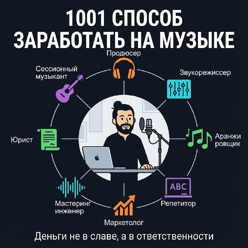 Многие думают: чтобы заработать в музыке, надо быть звездой и выступать перед толпой. Неправда. Звёзды — это 1%. Остальные 99% зарабатывают по-другому. Концерт — это не один человек Чтобы концерт состоялся, нужны десятки человек. Каждый получает свой кусок: - Концертный директор — договаривается с площадкой об аренде - Маркетолог — продвигает билеты, чтобы зал заполнился - Хореограф — ставит номера - Визионер/продюсер — придумывает, как выглядит шоу - Звукорежиссер — настраивает звук весь концерт (получает столько же за концерт, сколько и остальные музыкнаты или на з/п у площадки) - Сессионный музыкант — играет в оркестре, поет в хоре (1500–50 000₽ за концерт — зависит от востребованности артиста) - Бухгалтер — делит прибыль и минимизирует налоги - Юрист — пишет контракты, чтобы никто никого не обманул. Защищает интересы сторон в суде. Это один концерт. Деньги есть на каждом уровне, если ты хорошо делаешь свою работу. Студия и запись Если не хочешь концертный ад — работай в