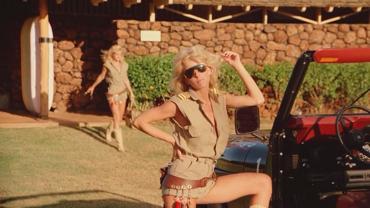 На самом деле можно привести аргумент в пользу того, что Сидарис не потерпел неудачу, потому что, по сути, «Заваруха на Гавайях» — это именно тот фильм, который хотел снять режиссёр. Я имею в виду, что никто не стал бы в здравом уме вставлять сцену, в которой джип таранит убийцу-скейтбордиста, сжимающего надувную куклу, а затем его падающее тело (и секс-игрушку) случайно уничтожает выстрел из базуки, верно? Однако то, как работает мозг Сидариса, явно отличается от того, как он работает у всех остальных. Запутанный сюжет каким-то образом оказывается одновременно агрессивно сложным и странно бесцельным. Из того немногого, что я смог понять из самого фильма, следует, что это простая история о противостоянии наркобаронов и хороших парней, подобные которой постоянно переснимала The Cannon Group (обычно с ниндзя), но в мире Энди Сидариса все женщины невероятно сексуальны, их прически идеальны, и они постоянно «на взводе», как озабоченные кролики.