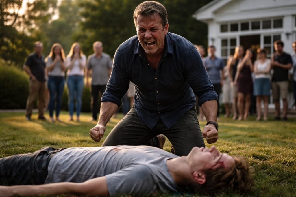 Денис отлетел назад, споткнулся, упал. Из разбитой губы потекла кровь — яркая, алая на бледной коже.