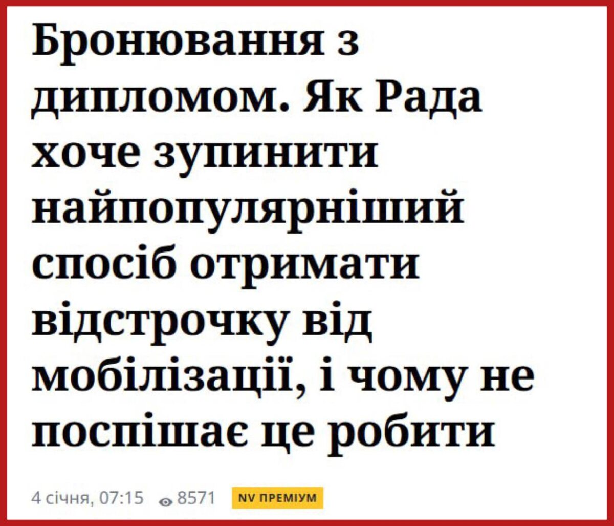 Секретарь образовательного комитета Верховной Рады Наталья Пипа сообщила, что в настоящее время в учебных заведениях начались серьезные проверки абитуриентов из-за огромного наплыва мужчин призывного возраста. По ее словам, подобным образом власти собираются бороться с наиболее популярным и действенным вариантом получения отсрочки от мобилизации - так называемым «профессиональным предвысшим образованием», которое является промежуточным этапом между школой и университетом. Подпишись на Телеграм Александр Семченко