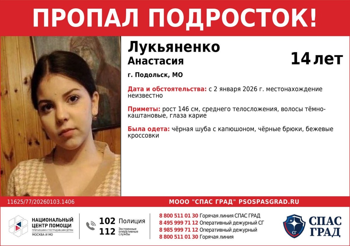 СПАС ГРАД сообщил о пропавших в Подольске двоих 14-летних подростках. Ребята исчезли 2 января. Тимофей Черкасов: рост 176 см, худощавого телосложения, русые волосы, голубые глаза. Был одет в черный пуховик, черные джинсы и черно-серые ботинки. При себе имел черную сумку. Анастасия Лукьяненко: рост 146 см, среднего телосложения, темно-каштановые волосы, карие глаза. Была одета в черную шубу с капюшоном, черные брюки и бежевые кроссовки. Любую информацию о местонахождении Тимофея или Анастасии можно сообщать по телефонам: 8 (903) 622-22-75 (Ольга), 8 (925) 125-67-28 (Наталья), 8 (495) 999-71-12 (оперативный дежурный).