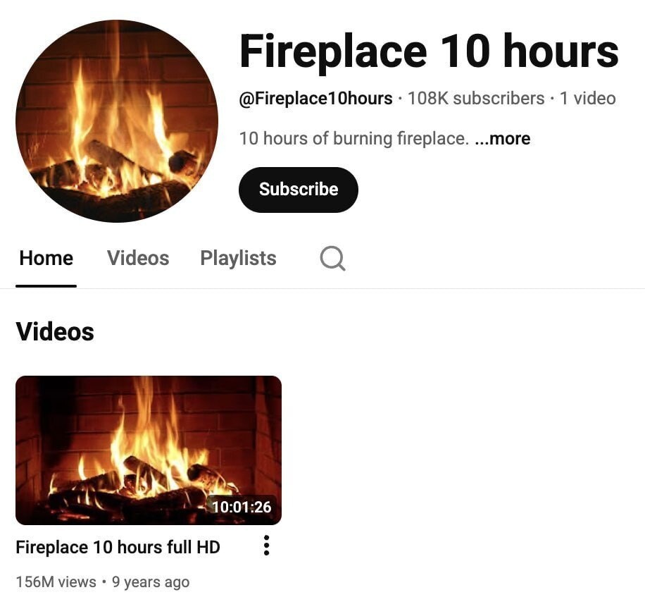 то вот вам идея Один человек 9 лет назад выложил на YouTube всего одно видео – 10 часов горящего камина. Без команды, без продакшена, без продвижения. И знаете что? Сейчас это видео приносит ему до 15 млн рублей в год, а алгоритмы YouTube до сих пор приводят к нему ~2 млн просмотров каждый месяц. Завидуем этому парню, но не от всего сердца.