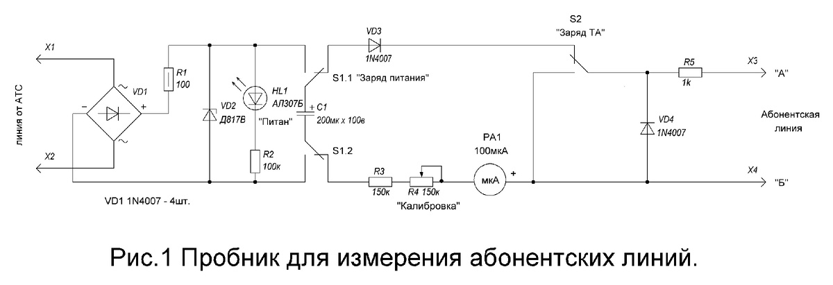 В бытность работы мной механиком АТС очень часто приходилось ремонтировать абонентские линии в одно лицо. Задача не очень сложная, но в том случае, если на телефонной станции имеется человек, который сможет прибором проверить целостность лини после проведённого ремонта и измерить сопротивление изоляции при котором телефон будет исправно работать, обычно минимальное сопротивление линии должно быть больше 20кОм. Если же на линии человек один, то задача усложняется. «Суровая жизнь» линейного механика заставила изобретать. Предлагаемый пробник для измерения абонентских линий позволяет проверить наличие телефона путем заряда ёмкости конденсатора, который находится в «звонковой части» каждого телефонного аппарата. При нажатии на кнопку S2 происходит разряд емкости в ТА через резистор R5, а при отпускании кнопки - заряд, что индицируется скачкообразным отклонением стрелки индикатора РА1 и возвращением её на ноль. Нужно учесть, что при длине линии более 4км индикатор показывает заряд, но это