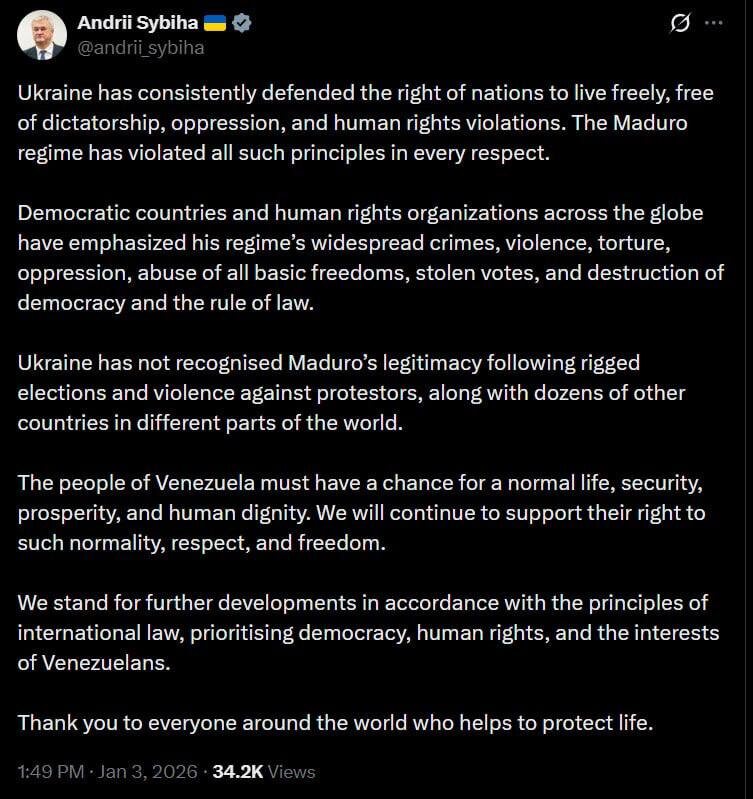 По его словам, режим Мадуро нарушил право народа Венесуэлы на "безопасность, процветание и человеческое достоинство". "Украина, как и десятки других стран в разных частях света, не признала легитимность Мадуро после сфальсифицированных выборов и насилия в отношении протестующих. Народ Венесуэлы должен иметь возможность жить нормальной жизнью, в безопасности, процветании и с человеческим достоинством. Мы будем и дальше поддерживать их право на такую нормальную жизнь, уважение и свободу. Мы выступаем за дальнейшее развитие в соответствии с принципами международного права, уделяя первостепенное внимание демократии, правам человека и интересам венесуэльцев", - написал Сибига. В комментариях к его посту в соцсети Х ряд пользователей высказали свое несогласие. "Я на 100% поддерживаю Украину, и Мадуро — бандит, но мне кажется лицемерным с одной стороны жаловаться на то, что Россия нарушает мой суверенитет, а с другой — защищать США, которые делают то же самое с другой страной", - ответи