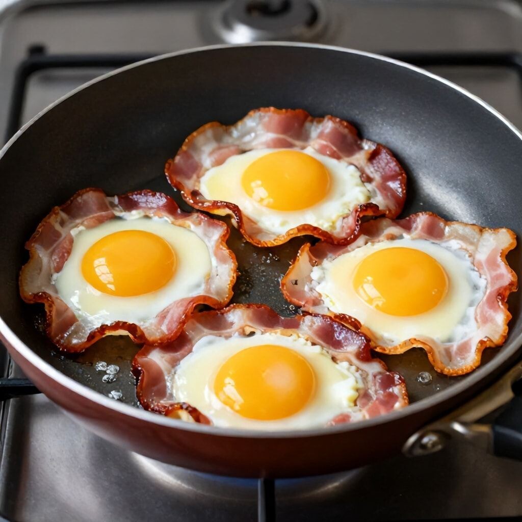 ЯЯйца, запечённые в беконе, — это сытное и ароматное блюдо, которое идеально подходит для завтрака или бранча. Готовится оно быстро, а результат впечатляет насыщенным вкусом и аппетитным видом. --- ### Ингредиенты: - Бекон — 8 полосок - Яйца — 4–6 шт. - Соль, перец — по вкусу - Свежая зелень (по желанию) - Сыр (по желанию) --- ### Приготовление: 1. **Обжаривание бекона**: Нагрейте сковороду на среднем огне и обжарьте полоски бекона до хрустящей корочки или чуть мягче. Готовый бекон выложите на бумажное полотенце, чтобы убрать лишний жир. 2. **Подготовка формы**: В небольшой сковороде или на сковороде с высокими бортами выложите бекон так, чтобы он образовал «чашечки» или плотно прилегал друг к другу. 3. **Добавление яиц**: Осторожно разбейте яйца в «беконовые чашечки». Если хотите, можно сделать небольшое углубление в беконе, чтобы яйца лучше держались. 4. **Готовка**: Накройте сковороду крышкой и готовьте на слабом огне до желаемой консистенции яиц — с жидким желтком или более прожар