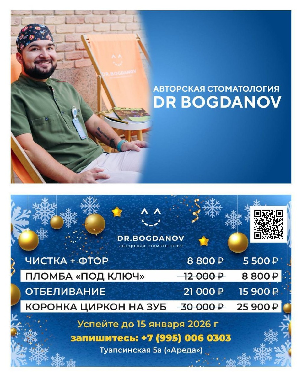 ! Для подписчиков @dr_bogdanov мы подготовили праздничное предложение с выгодой до 33%: • Профессиональная гигиена (4 этапа + фтор) — 5 500 ₽ (вместо 8 800 ₽) • Пломба под ключ — 8 800 ₽ (вместо 12 000 ₽) • Коронка циркон на зуб — 25 900 ₽ (вместо 30 000 ₽) • Профессиональное отбеливание — 15 500 ₽ (вместо 21 000 ₽) 📅 Предложение действует до 15 января 2026 года. Почему стоит выбрать авторскую стоматологию DR.БОГДАНОВ®: • лечение под микроскопом и бинокулярами — когда важна каждая деталь; • современные технологии и авторские методики уменьшения стресса; • нетравматичные удаления с применением хирургического ультразвука; • полностью цифровой подход — 3D-сканирование вместо обычных слепков; • и личный контроль лечения главным врачом. ⸻ Запишитесь прямо сейчас +7(995)006-03-03 или онлайн — drbogdanov.site и копите кешбэк с первого визита. Всё будет спокойно. Точно. Предсказуемо 😊 📍 Сочи, ул. Туапсинская, 5А (мкр-н Ареда) ⸻ DR.БОГДАНОВ® — авторская стоматология & экспресс-анализы
