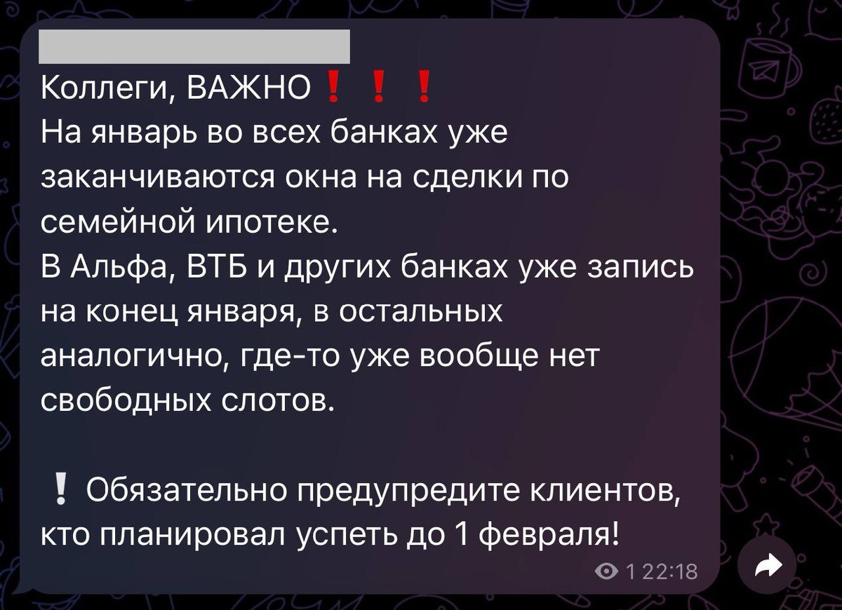 ⏳ Информация из первых рук: в банках настоящий аврал, и свободные слоты на оформление семейной ипотеки тают на глазах. С 1 февраля 2026 года вступают в силу изменения по принципу «одна семья — одна льготная ипотекa». Сейчас в банках — пиковая нагрузка. Свободные «окна» на одобрение стремительно закрываются. Наша команда работает на пределе даже в праздники, чтобы помочь вам успеть: 🟠Мониторим, в каких банках ещё есть возможность принять заявку. 🟠Помогаем собрать документы в режиме «спринта». 🟠Берём на себя всю координацию с банком, чтобы уложиться в сжатые сроки. Если вы планируете использовать возможность оформить две ипотеки (например, на жильё и на инвестицию), решение нужно принимать прямо сейчас. Запись после 20 января будет практически недоступна. Пишите: 💬 Теlegram 💬 MAX P.S. Цель не просто «успеть», а выбрать ликвидный объект. Мы поможем совместить скорость с выгодой.
