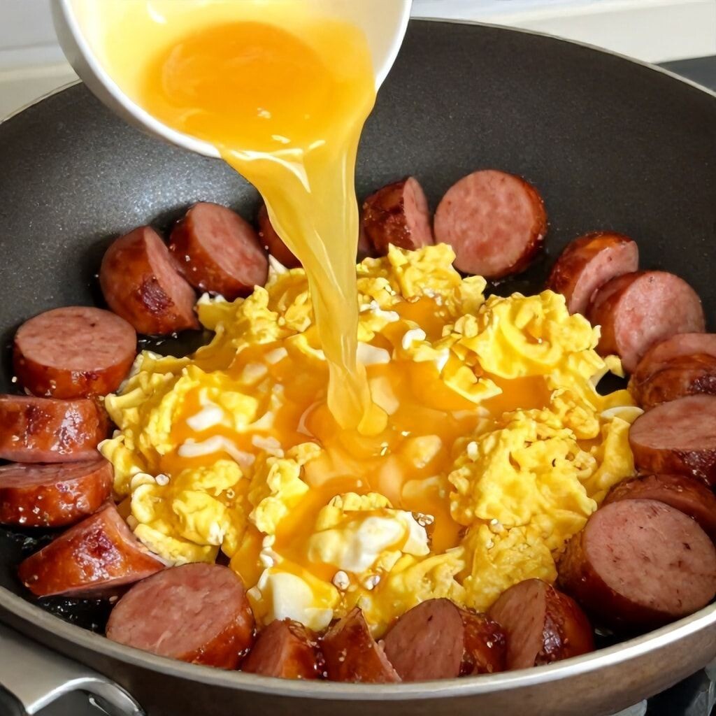 - Обжариваем колбасу до золотистой корочки (1–2 минуты). Если хотите, можно добавить овощи.