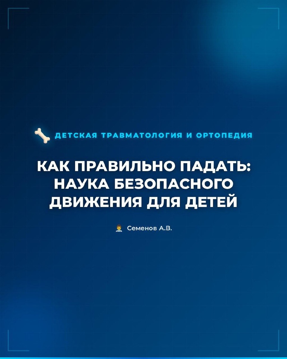 #детская_травма 👋 Привет, друзья! На связи Андрей Семенов. 👨⚕️ 🔬 Падение — это БИОМЕХАНИЧЕСКИЙ ПРОЦЕСС. 🔜 При потере равновесия тело движется с определенной скоростью, и его КИНЕТИЧЕСКАЯ ЭНЕРГИЯ должна быть погашена. 🔜 Если энергия останавливается резко и в одной точке — страдают кости и суставы. Если распределяется по всему телу и во времени — травмы минимальны. 🦴 У детей скелет более эластичный, но есть УЯЗВИМЫЕ ЗОНЫ: запястья, локти, ключицы, позвоночник и голова. 🟡 Большинство переломов происходит не из‑за силы падения, а из‑за НЕПРАВИЛЬНОЙ ТЕХНИКИ — прежде всего падения на прямые руки. ⚠️ ГЛАВНОЕ ПРАВИЛО: НИКОГДА НЕ ПАДАТЬ НА ВЫПРЯМЛЕННУЮ РУКУ. ✏️ В этом случае рука превращается в жесткий рычаг, и вся нагрузка передается на лучевую кость и локтевой сустав. 🔜 Это самая частая причина переломов у детей 5–12 лет. ⚡️ ОСНОВНОЙ ПРИНЦИП БЕЗОПАСНОГО ПАДЕНИЯ — УВЕЛИЧИТЬ ПЛОЩАДЬ КОНТАКТА И ВРЕМЯ ТОРМОЖЕНИЯ. ✏️ Для этого используется ГРУППИРОВКА, СГИБАНИЕ СУСТАВОВ и ПЕРЕКАТ. Че