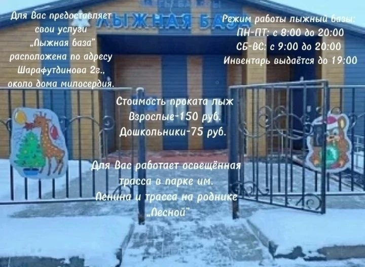 На лыжной базе, расположенной в городе Мензелинск по адресу: улица Шарафетдинова, 2г (около Дома милосердия), можно взять лыжи напрокат. Режим работы лыжной базы: · Понедельник – пятница: с 8:00 до 20:00. · Суббота – воскресенье: с 9:00 до 20:00. · Важно: инвентарь выдается до 19:00. Для лыжников работают освещённые трассы: 1. В парке им. Ленина. 2. На роднике «Лесной».