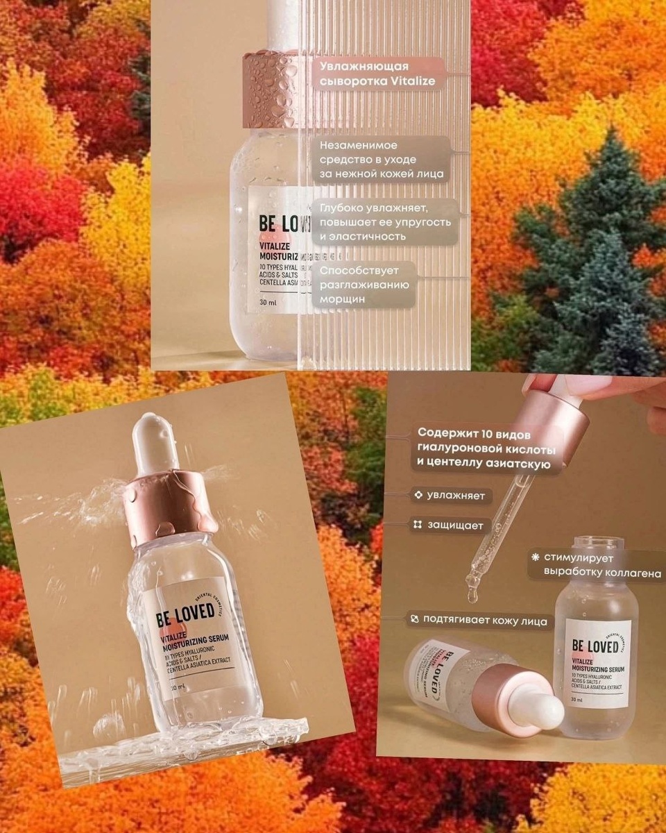 ✨ Хотите раскрыть секрет сияющей и здоровой кожи? Тогда познакомьтесь ближе с нашими уникальными сыворотками — настоящими сокровищницами полезных ингредиентов! ✅ Что делают сыворотки? Эти мощные продукты содержат высокую концентрацию активных веществ, проникающих глубоко в слои кожи и мгновенно устраняющих любые недостатки. Увлажнение, осветление, восстановление защитных функций, борьба с воспалениями, уменьшение морщин и повышение упругости — всего лишь некоторые из эффектов, которыми обладают наши сыворотки. 🍀 Два уникальных продукта линии BeLoved ♦️ Увлажняющая сыворотка Vitalize 🍀 Содержит эксклюзивный комплекс из десяти типов гиалуроновой кислоты и ценнейшего экстракта центеллы азиатской. Обеспечивает глубокое увлажнение, защиту и стимуляцию выработки собственного коллагена вашей кожей. Кожа станет нежной, увлажнённой и идеально ровной. 🌸 Ночная восстанавливающая сыворотка с ретинолом 🌸 Сыворотка с активным витамином A активно обновляет клетки кожи изнутри, делая её пл
