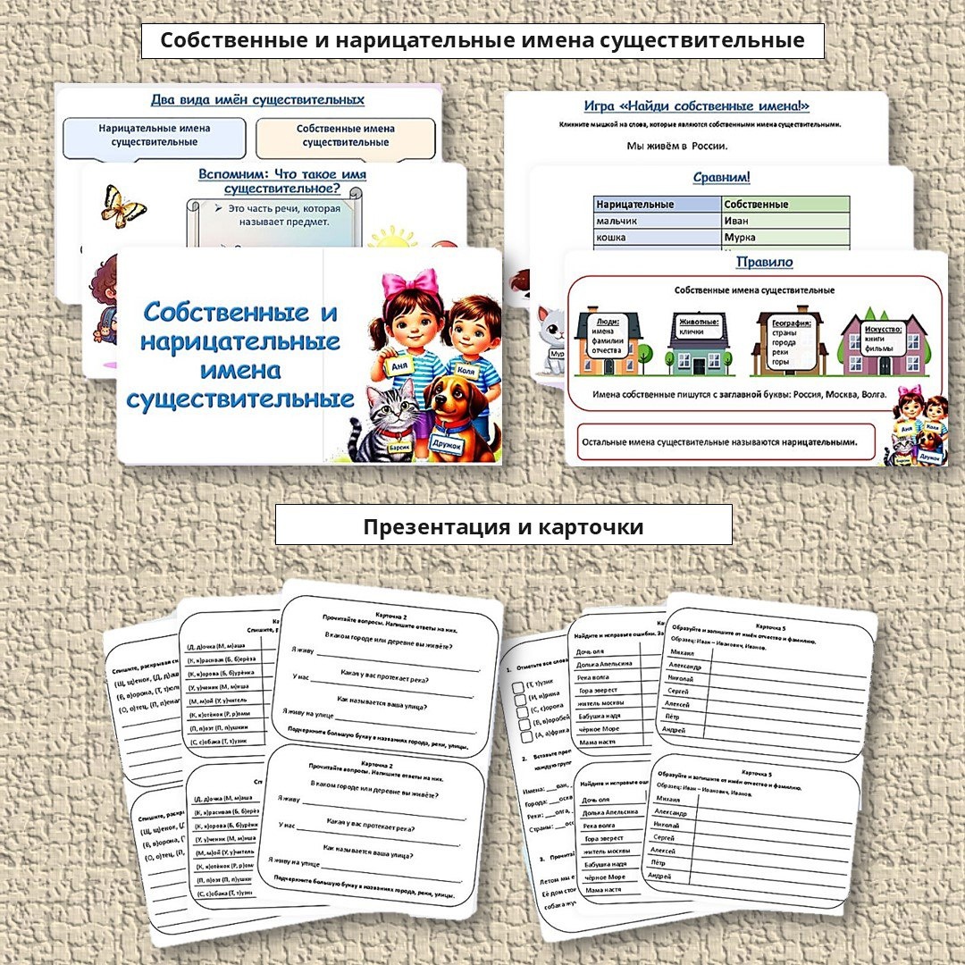 Комплект "Собственные и нарицательные имена существительные" (презентация и карточки). Презентация «Собственные и нарицательные имена существительные». Презентация состоит из 13 слайдов и включает в себя: — чёткие и доступные определения понятий «собственные» и «нарицательные имена существительные»; — яркие, наглядные примеры с пояснениями; — два интерактивных задания, позволяющих закрепить изученный материал на практике; — подробные ответы с разбором, которые помогут учителю организовать проверку и обсуждение; — финальный слайд «Рефлексия», способствующий осознанному подведению итогов урока и оценке собственного понимания темы учащимися. Карточки по русскому языку «Правописание собственных имён существительных». В разработке 7 разнообразных карточек. Задания охватывают различные типы собственных названий: имена, фамилии, клички животных, названия городов, рек, стран. Цена комплекта 500 руб. Приобрести можно по ссылке payform.ru/81agXK9/