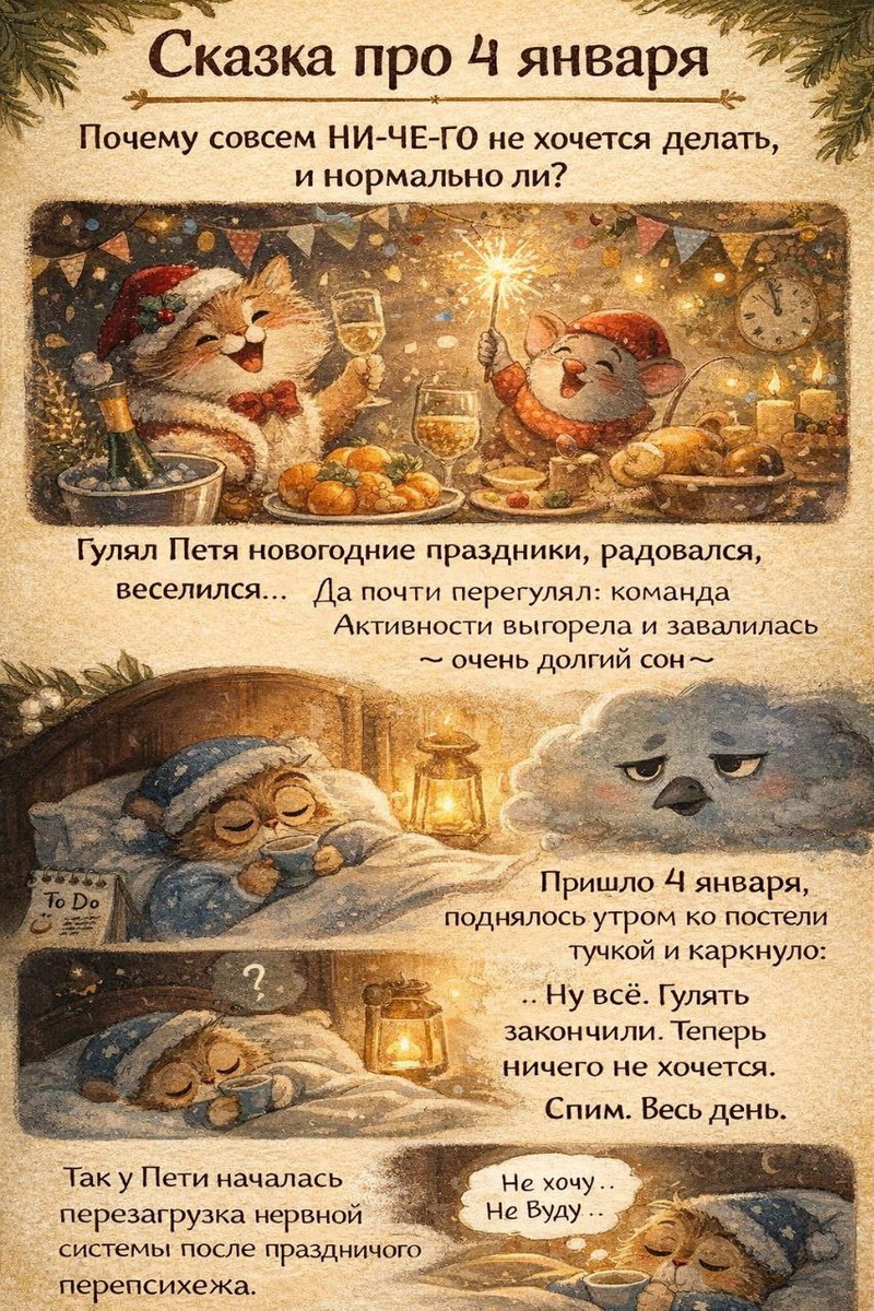 Жили-были в одном теле: Мотивация, Нервная система, Энергия и человек по имени Я. Новый год они гуляли так, что Мотивация танцевала на столе, Энергия пела в караоке, а Нервная система держалась за люстру и кричала: «Я МОГУ ЕЩЁ!» А потом наступило 4 января. Мотивация не пришла на работу. Энергия не взяла трубку. Нервная система лежала под одеялом и шептала: — Я умерла. — Но понарошку. — Просто не трогайте меня. Человек Я подошёл к зеркалу и спросил: — А что делать? Из-под подушки вылезла Лень в халате и сказала: — Ничего. Сегодня у нас день «НИ-ЧЕ-ГО». — Но мне надо жить… планы… цели… новая жизнь… — Завтра, — сказала Лень. — Сегодня мы лечим систему. И человек: поел, попил, полежал, вышел на 10 минут, и перестал себя ненавидеть. К вечеру Мотивация осторожно выглянула из-за дивана: — Ты не будешь меня ругать? — Нет. — Тогда я завтра приду. И пришла. Мораль сказки: Если 4 января ты — овощ, значит внутри идёт ремонт. Не мешай рабочим 🧠🤍