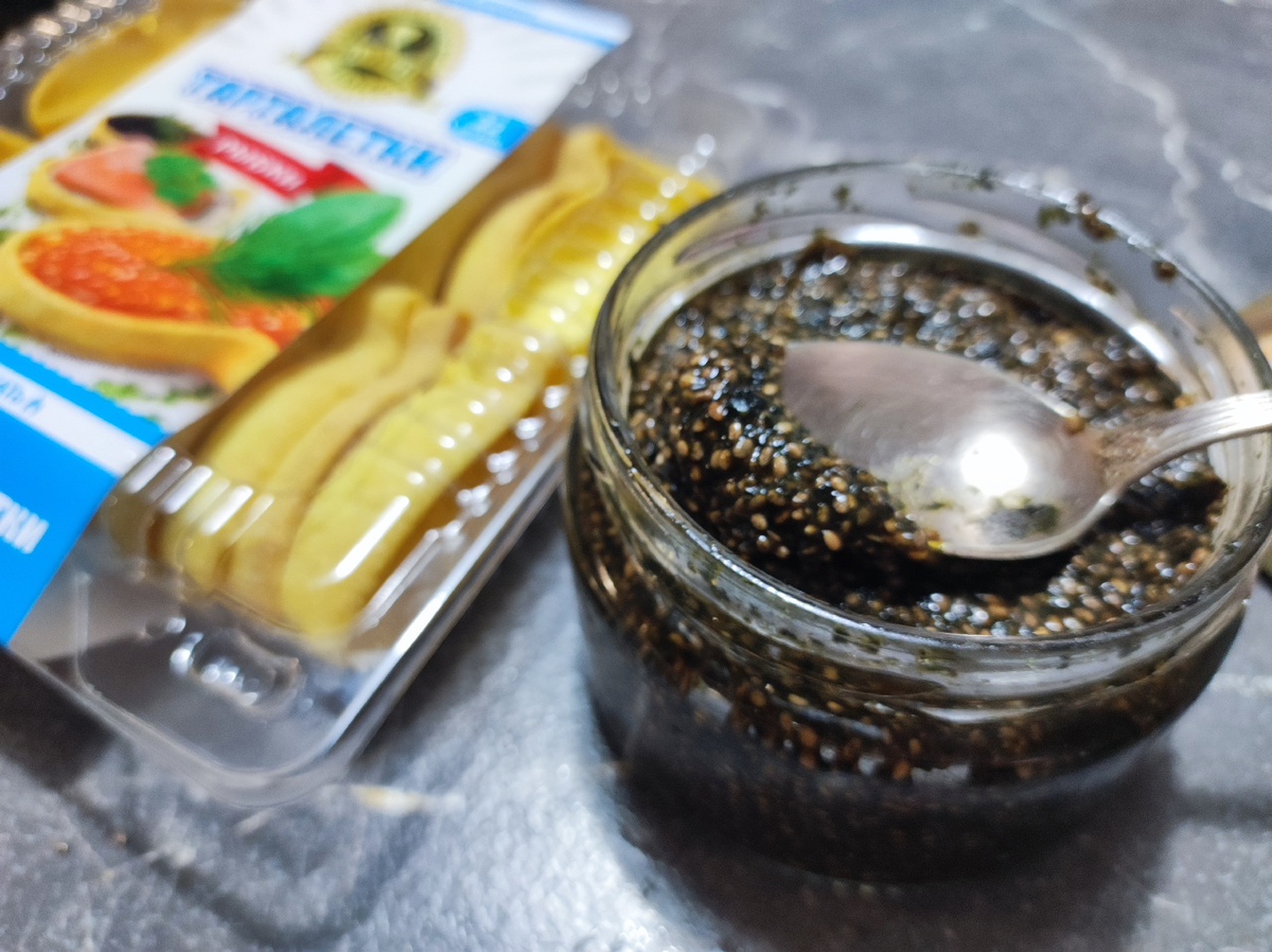 Кто ел чёрную икру и ещё помнит её вкус тот счастливый человек. Мне уже трудно вспомнить когда это было. Но я знаю, что в магазине была такая чёрная икра, которую мы называли искусственная или имитированная . Прошло каких то несколько десятков лет и вот она опять стала популярной. Дело даже не в цене, настоящая для многих дорогое удовольствие , а в том что имитированная икра полезнее для человека и отличный белковый продукт. Дожили теперь черная икра будет у всех на столе каждый день. Рецепт быстро разошелся по всему интернету и новогодний стол пополнился еще одним блюдом. Мне тоже захотелось приготовить икру самой и я приступила к исполнению задуманного. Все что нужно для икры можно купить в любом магазине. Семена чиа , соевый соус , льняное масло и нори. Рецепт самый простой и быстрый , но варианты разные . Кто то берет 3 столовые ложки семян , кто то 2 столовые ложки , остальное это - вода 60 мл - 100мл , соевый соус 3 столовые ложки , водоросли нори 2 листа . Я д