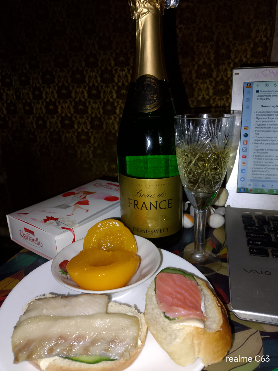 1 января я допила шампанское и заела бутерами. Получилось так, что мне показалось, не стоит перебарщивать с продуктами, и мясо оставила мариноваться ещё на сутки. Кстати, шампанское, то есть игристое вино, было вкуснее, чем в лучшие времена «Абрау-Дюрсо» и «Боско». Меня им сын угостил вместе со сладостями. Я не планировала выпивать всю бутылку и думала символически про бокал. Убрала на холод, а утром холодненькое было таким приятным, и вкус интересный, без чрезмерной сладимости и кислинки, газики мелкие, голова не болела. Мясо сутки в маринаде пролежало. Вместе с маринадом запихала в рукав и подкинула три целых яблока для аромата и мандаринку. Аромат стоял улётный. Маринад: 2 ч.л горчицы, 1ст.л мёда любого, (можно и сироп от варенья прозрачный), 1 ст.л майонеза и полстакана соевого соуса, черный перец и травы кавказские сушёные, 1 ч. л карри. Карри как и куркума очень подходят к светлому мясу и куре. Чеснок загнала в прорези в мясо. Из печеных яблок кашицу пюрешную взбила вилкой как