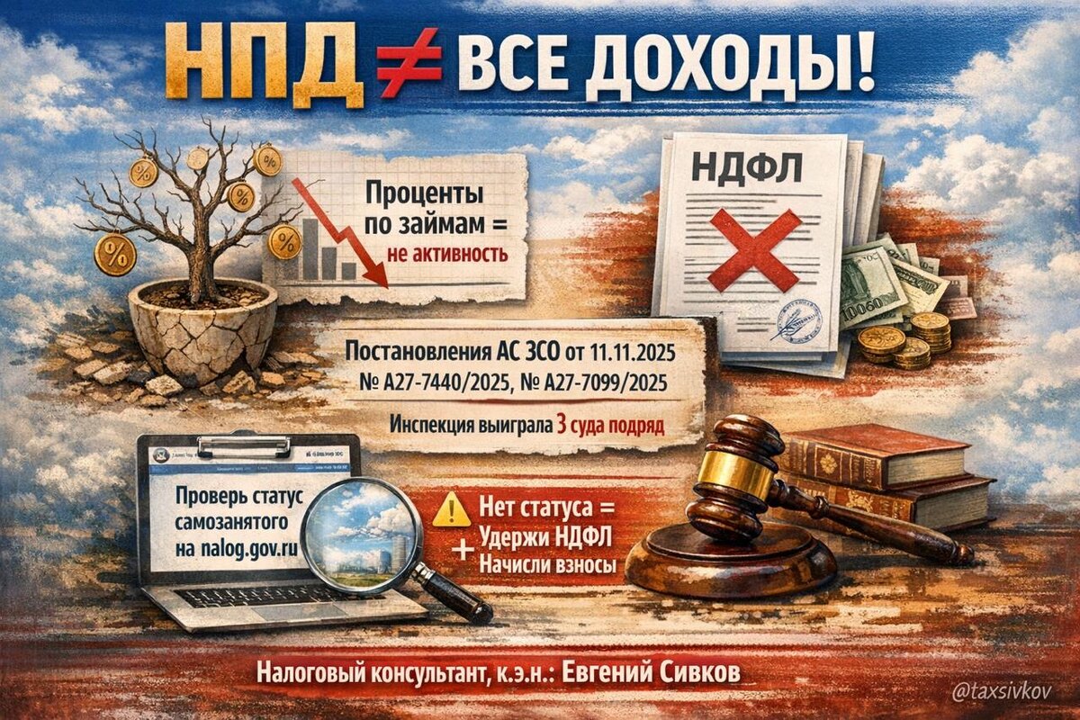 ! 💸 Получил процент по займу — плати НДФЛ, даже если самозанятый. Так решил АС Западно-Сибирского округа в постановлениях от 11.11.2025 по делам № А27-7440/2025 и № А27-7099/2025. 📌 Победила инспекция. 🔍 Суть: компания выплатила проценты самозанятым заимодавцам. Но суд подтвердил: НПД применяется только к активным доходам — за товары, работы, услуги. Проценты — пассивный доход, и под спецрежим не попадают (ч. 1 ст. 6 закона № 422-ФЗ). ⚠️ Минфин давно предупреждал: 📄 письма от 01.09.2023 № 03-11-11/83511 и от 09.02.2023 № 03-11-11/10501. Аналогичные выводы — у судов Москвы, СЗФО и УрФО. 📲 Проверь статус самозанятого на nalog.gov.ru — ИНН + дата = официальная проверка. Если статус не подтверждён или утратился — удерживай НДФЛ и начисляй взносы. 👉 Больше про налоги, книги и налоговую защиту — здесь: https://taplink.cc/booksivkov #самозанятые #НПД #НДФЛ2026 #налогинадоход #ФНС #проверкастатуса #бизнесбезпаники