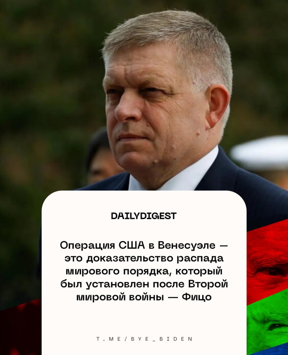 : 🔹Операция США в Венесуэле — это доказательство распада мирового порядка, который был установлен после Второй мировой войны, — Фицо. 🔹Президент Гондураса назвала похищение Мадуро варварской акцией. 🔹Экстренное заседание Совета Безопасности ООН по Венесуэле пройдет в понедельник в 18:00 мск. 🔹Дональд Трамп заявил, что не планирует осуществлять военные операции в отношении Кубы. 🔹Десятки человек пришли к Белому дому на митинг против агрессивных действий США. 👍«БайБайден» в МАХ