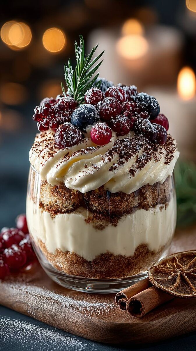 Новогодний десерт — тирамису с зимними ягодами и праздничным декором, фуд-фото, ультрареализм, крупный план в вертикали; порционный тирамису