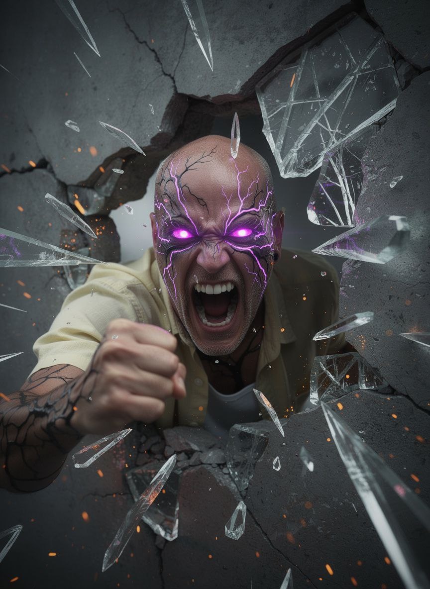 Гиперреалистичный кинематографический крупным планом человека, кричащего в сильной ярости. Его глаза светятся ярким, сверхъестественным пурпурновым светом, из них излучаются энергетические вены. Его кожа покрыта темными, замысловатыми трещинами, как будто его тело разбивается, как фарфор. Он пробивает рушащуюся бетонную стену, вокруг него подвешены большие острыми осколками разбитого стекла и светящиеся оранжевые угля. Темная, угрюмая атмосфера, драматическое высококонтрастное освещение, разрешение 8к, фотореалистичность ➡️ Тут БОТЫ 💵 Отблагодарить