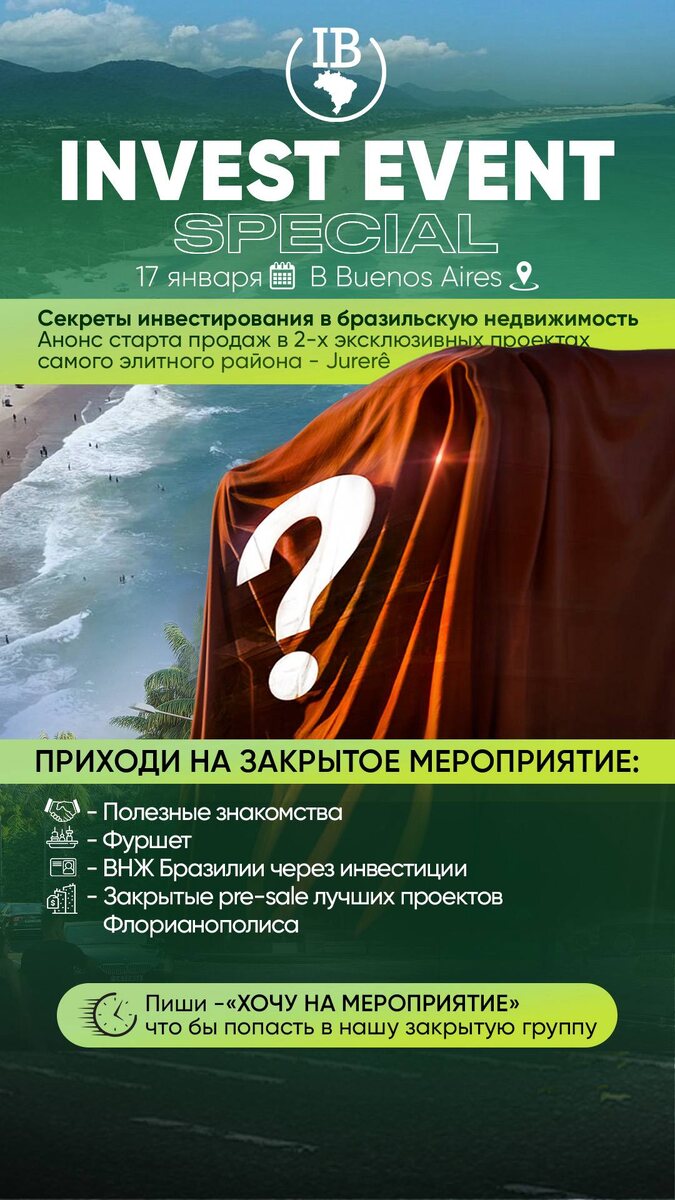 ) 🇦🇷 🗓 17 января (суббота) ⏰ 12:00 - сбор гостей/фуршет 🍷 ⏰ 13:00 - Почему Флорианополис❓ ⏰ 14:00-14:30 - закрытый pre-sales 2-х уникальных проектов в самом элитном районе Флорианополиса 🇧🇷 (Jurerê) 🔝 Места ограничены ❗️ Вход строго по предварительной записи❗️ Для записи и добавления в закрытую группу мероприятия - пиши мне «ХОЧУ НА ИНВЕСТ МЕРОПРИЯТИЕ - БУЭНОС-АЙРЕС» 👇 @invest_in_Brazil 🔥 Евгений В этом посте есть большое видео, которое не загрузилось в Дзен. Откройте оригинал поста в телеграме, чтобы его посмотреть