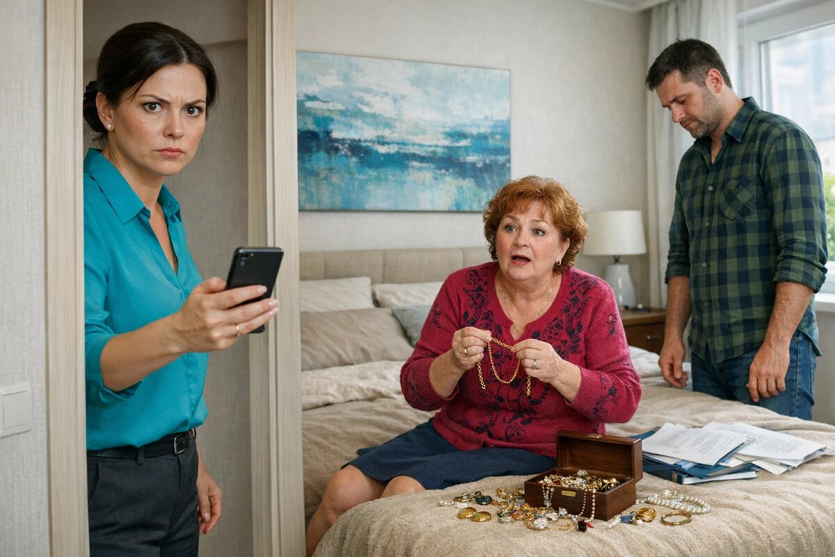 Анна толкнула дверь. Щель сантиметров в пять. На кровати — их с Павлом кровати — сидела Антонина Ивановна. Перед ней на покрывале лежали раскрытая шкатулка Анны и документы на машину. Свекровь держала в руках золотую цепочку. Ту самую, что Анна получила от бабушки.