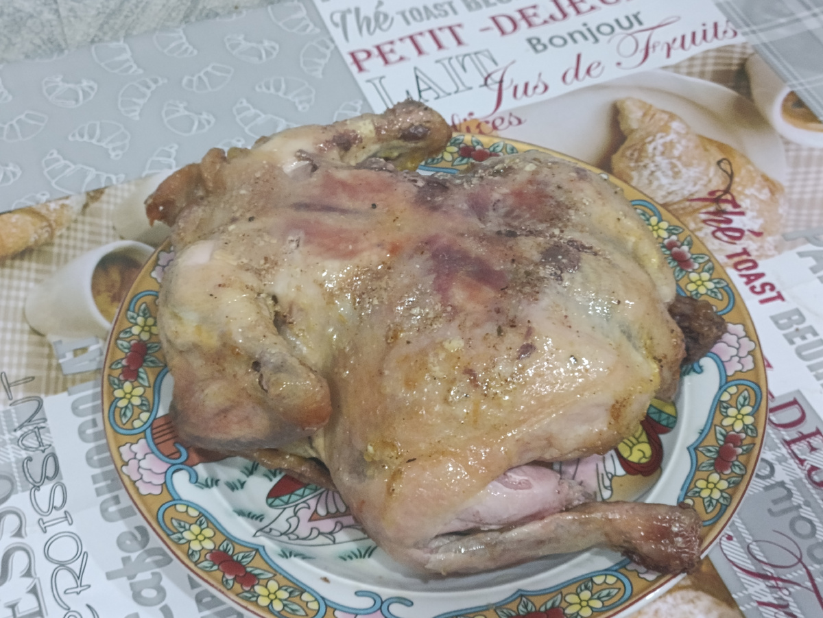 Вечером запекала курочку. Если муж работает 31 декабря, то 1 января курочка обязательна. Готовлю по простому: специи и соль смешиваю с майонезом и этим соусом натираю тушку со всех сторон и в духовку на 220-250 градусов до готовности. Может выглядит не презентабельно, но зато очень вкусно.