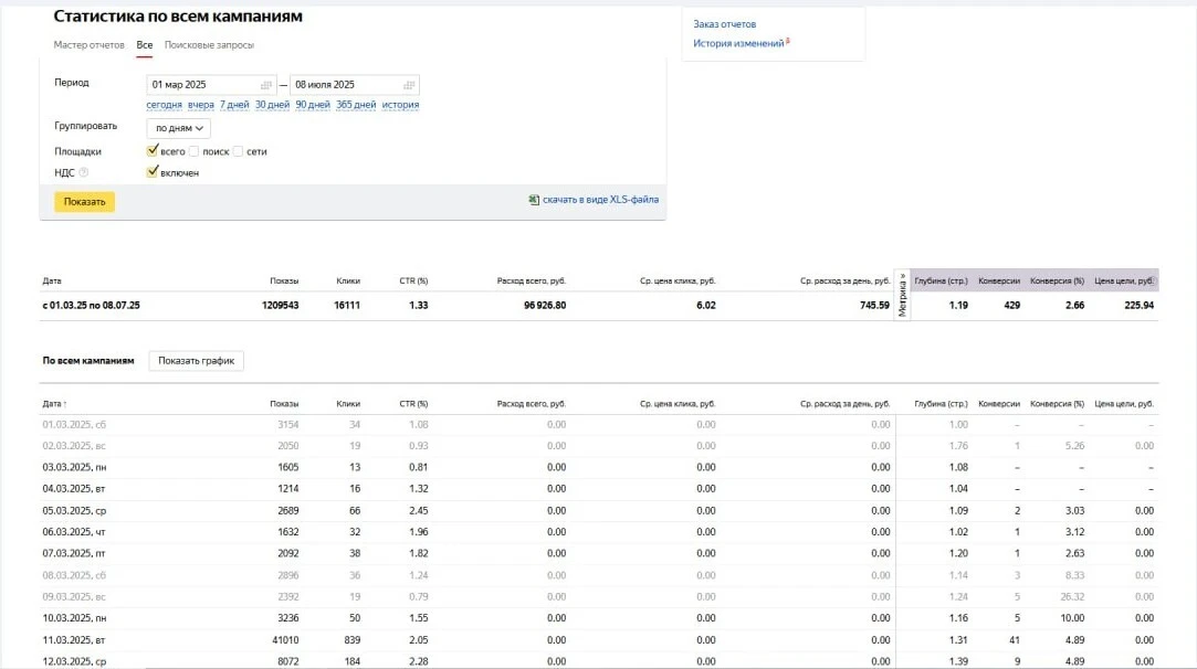 Посмотрите на реальные цифры из статистики (данные из Яндекс Директ за период 01.03.2025 - 08.07.2025 по 3 регионам):