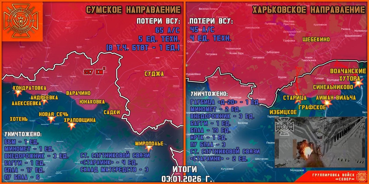 Военкоры опубликовали сводку о положении дел на курско-сумском направлении на утро 4 января, штурмовики группировки «Север» продолжают продвигаться вглубь Сумской области, используя авиацию, артиллерию и «солнцепеки». Однако боевики ВСУ оказывают ожесточенное сопротивление в обороне. Уточняется, что они бросают в необстрелянные резервы. - В подчинение командованию 71 оебр ДШВ ВСУ Киев перебросил батальон 1 отмбр. Военных планируют задействовать в качестве штурмовиков, - сообщает телеграм-канал «Северный Ветер». Предполагается, что переданный личный состав задействуют в «мясных штурмах» в районе Варачино и Алексеевки. Возле Грабовского Краснопольского района Киев перебрасывает личный состав батальонов обеспечения учебных центров ВСУ, говорится в информации. В основном это солдаты, не имеющие боевого опыта.