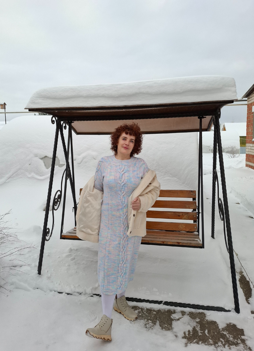 Это платье "родилось" у меня в январе 8 лет назад. Надеваю его только в холодное время, поэтому оно полностью соответствует названию. Когда облачилась в него впервые, кто-то воскликнул: "Мне показалось, что в комнату вошла Радуга". Такой необычный у него цвет: переливы нежных оттенков розового, жёлтого и голубого на белом, словно сверкающая на солнце сосулька. Пряжа "Подмосковная" секционного окрашивания. Состав 50% шерсть, 50% акрил. Метраж - 100 гр. - 250 м. Привлёк меня в этой пряже именно необычный цвет, значившийся на этикетке как № 4080. Нить прекрасно ложилась в узор, создавая причудливые мелкие и крупные радужные разводы. Платье связано регланом сверху, без швов. По центру узор из сложной косы. Такой же украшает рукава. А с двух сторон от него чередуются полоски лицевой глади и платочной вязки. Платье приталенного силуэта, книзу чуть расширяется путём синхронного добавления петель в полосках лицевой глади по бокам косы. Спинка платья тоже украшена косой. Длина платья 110 сантим