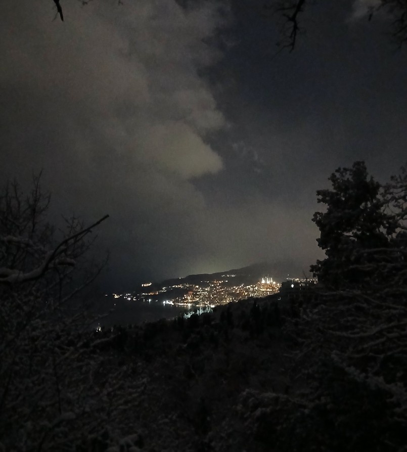 Одолев перевал и отдохнув рванули мы на встречу Нового года. Времени в обрез, а идти далеко. Решили через парк пробираться, а парк тот 35 гектар)) Спустились, значит, в парк и попали в зимнюю сказку: заснеженный лес, причудливые деревья, яркая луна среди таинственных облаков светит и такая это была красота, что уходить оттуда не хотелось. Плюс красивая музыка доносилась из стоящей где то внизу гостиницы. В общем зависли мы там. Да и то сказать - а куда нам торопиться? Какая разница будем ли мы в самый пик тут или на набережной, салюты всё равно запрещены а остальное никуда не убежит. Поэтому потихоньку шли по дорогам, дорожкам, лестницам и тропинкам. Так не спеша дошли и до набережной. Ну понятно - музыка, народ, всё сверкает. Много точек с горячими напитками и цена на них гораздо ниже, чем видели летом в Севастополе, где стаканчик кофе стоил 240 рэ. Выпили для сугрева в кофейне по 140 рублей, а потом набрели где вообще наливали по 60 рублей за тот же стаканчик. Ну и вкусом никто не о