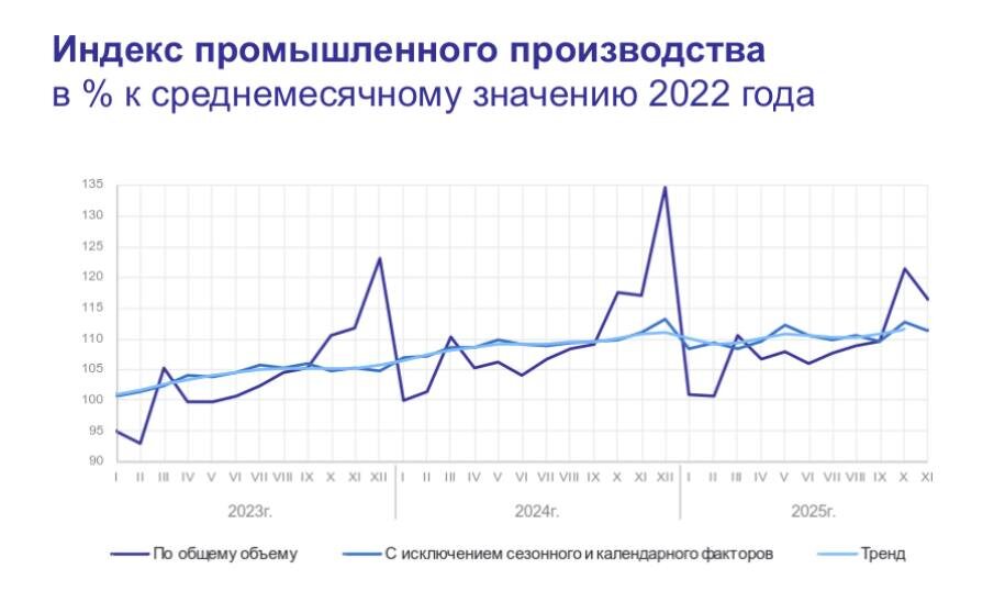 В этой статье мы поговорим об общем замедлении промышленного роста в России на фоне разнонаправленной региональной динамики. Промышленное производство в Российской Федерации упало в ноябре, как к ноябрю прошлого года (99,3%), так и к октябрю 2025 года (95,9%). Соответственно, за 11 месяцев текущего года промышленный рост России замедлился до 100,8%. Ситуация в регионах страны разнонаправленная. В 39 субъектах РФ в январе - ноябре текущего года зафиксирован рост индекса промышленного производства. Наибольшие значения индекса в Курганской области (125,3%), Хабаровском крае (118,0%), Калужской области (113,9%), Республике Татарстан (111,6%), Республике Ингушетия (110,6%), Калининградской области (110,3%). Индекс промышленного производства в Республике Башкортостан за период 11 месяцев (январь - ноябрь) составил 96,1%, ускорив в ноябре падение к прошлому году (93,9%). Источник: росстат. 📑Экономика от Ахунова Рустема