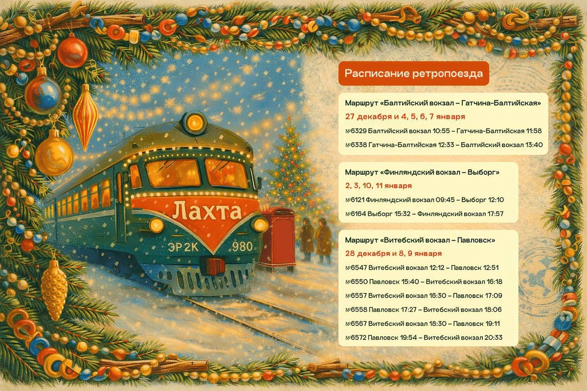 #афишаСПб ▫️▫️▫️▫️ ▫️▫️▫️▫️▫️▫️🧤 ▫️ ▫️▫️▫️▫️▫️ 2⃣0⃣2⃣6⃣▫️▫️▫️▫️▫️⛄ 💡💡💡💡💡💡💡💡💡💡💡 В последнее время меня захватила волна советского ретро. Ретро-образ, увлекательное новогоднее путешествие в период "оттепели" в музее "Невская застава", большая симпатия к историям канала "Брежневка в Купчино", чтение советских авторов, а просмотр старых фильмов - и моя традиция в дни новогодних каникул. Делюсь еще одним интересным ретро-событием. В праздничные выходные в нескольких популярных направлениях курсирует ретро-состав "Лахта". "Лахта" - это восстановленный пассажирский состав 1970-х гг., который с 2023 г. используется на туристических маршрутах из Петербурга. Поезд вмещает до 737 пассажиров, а его интерьер воссоздан в стиле 70-80-х гг. XX века: салоны украшены тематическими аксессуарами, а также оснащены деревянными креплениями для спортивного инвентаря. Фото на память в необычном интерьере, история советского лыжного спорта, новогоднее настроение - и время в пути пролетит неза