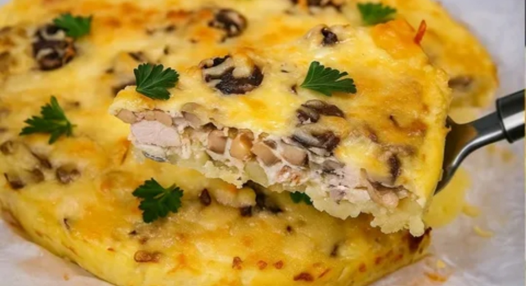 - В смазанную маслом форму выложите слоями: слой картофельного пюре, затем подготовленные мясо и грибы со сливками сверху. Поверхность посыпьте сыром, натёртым мелко.